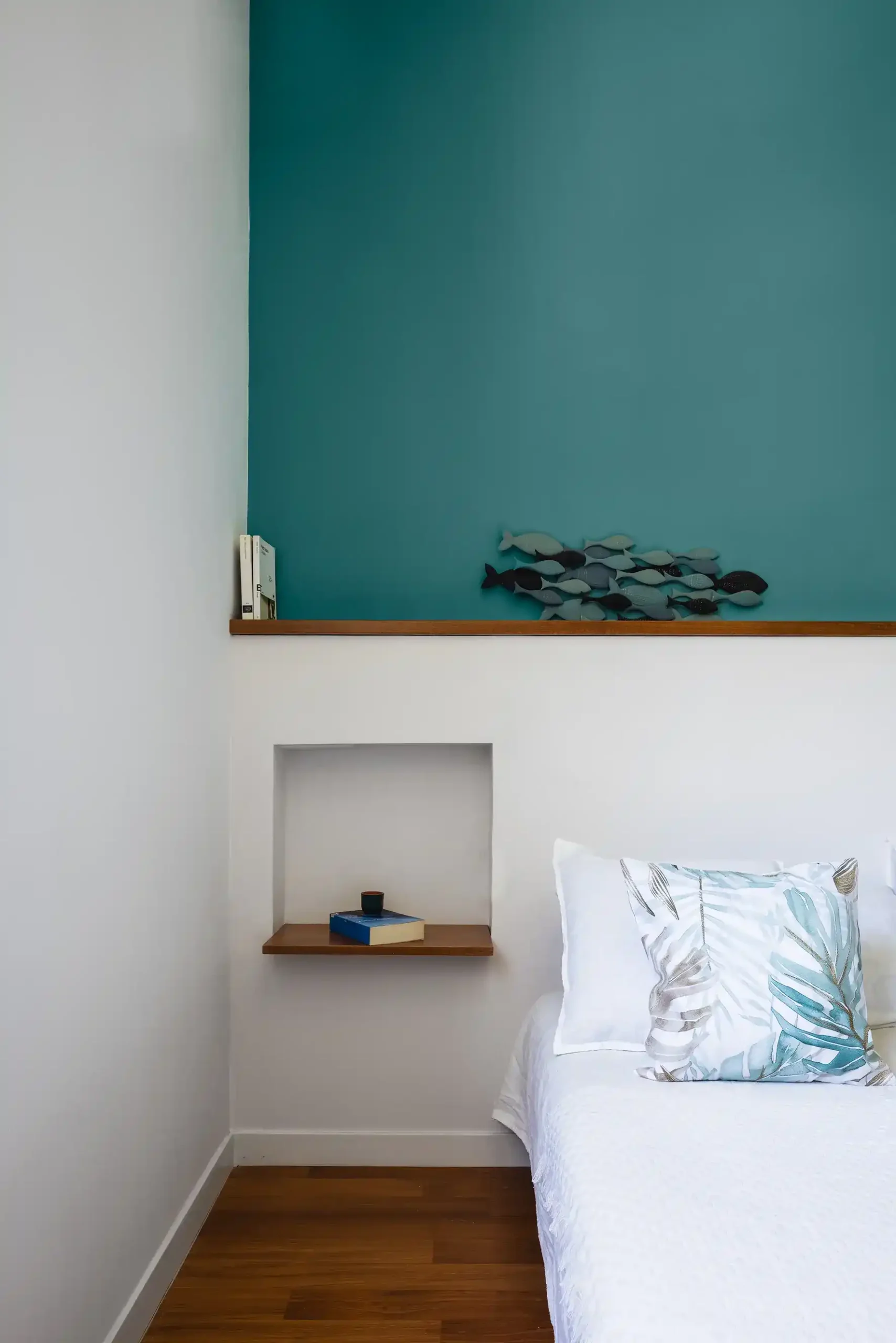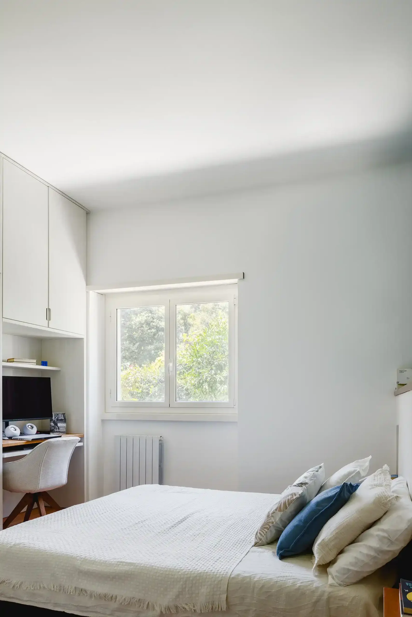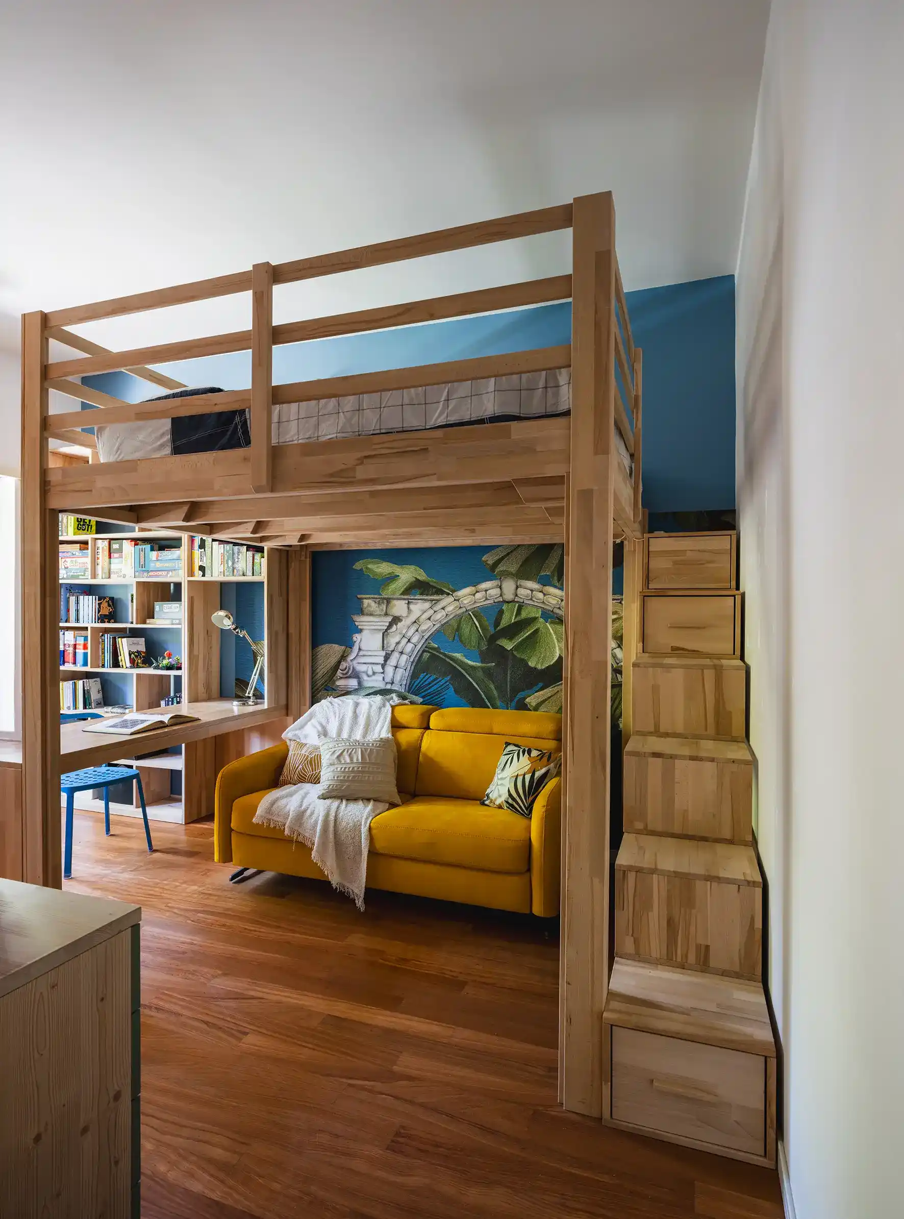 La camera del ragazzo è pensata per essere multifunzionale: oltre al riposo, ospita anche uno studio e uno spazio per accogliere gli amici. Grazie a un letto a soppalco e a una vivace carta da parati jungle, l’ambiente si trasforma in un vero e proprio spazio dinamico e accogliente.