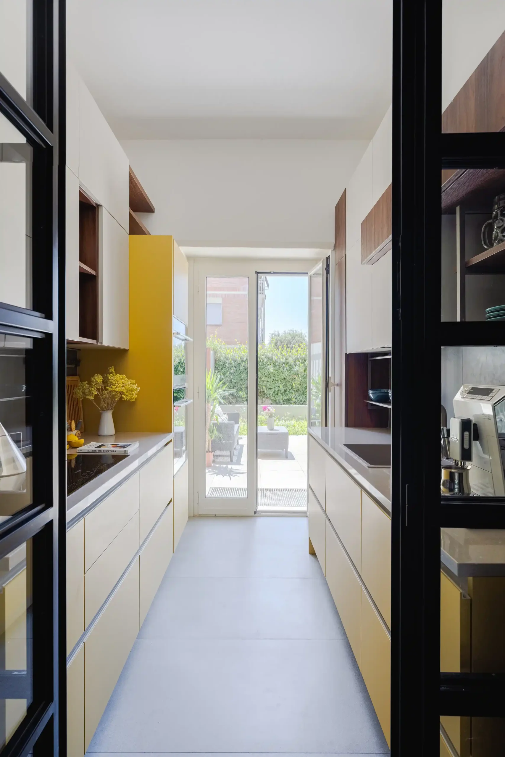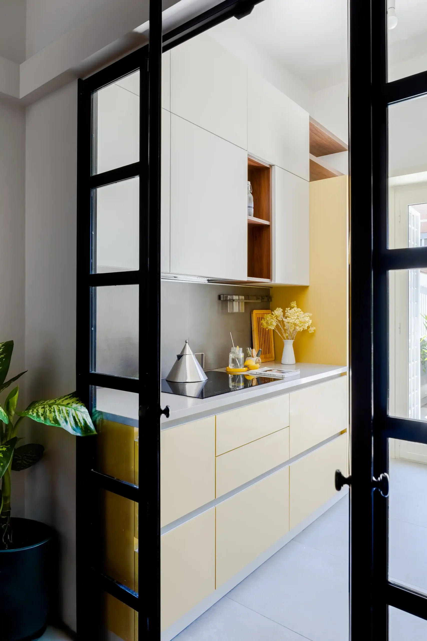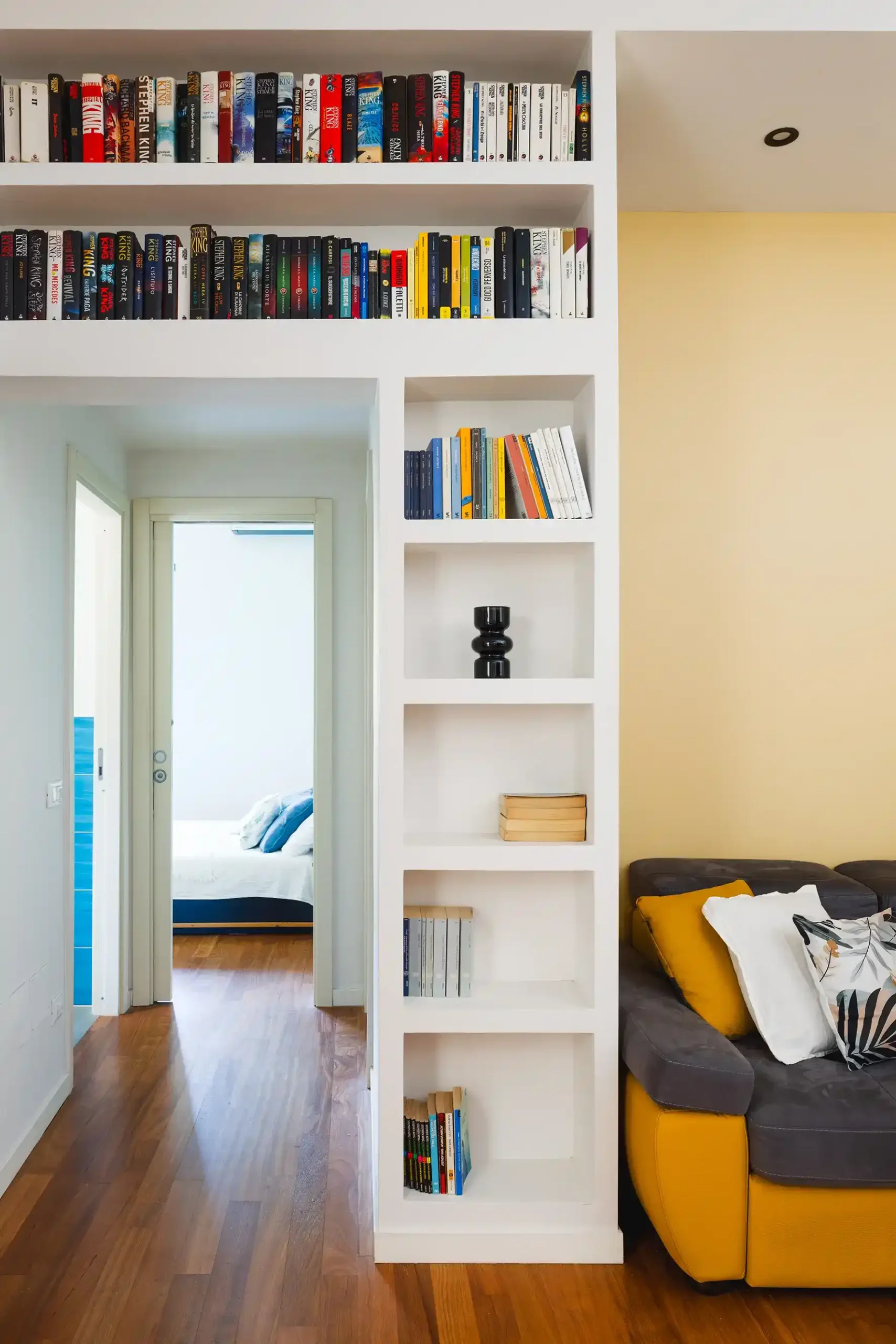 L’intervento è stato essenziale, mirato a rendere gli spazi più funzionali con due colori distintivi: giallo per la zona giorno e sfumature di blu per la zona notte. Nel soggiorno, insieme alla cucina, sono state ridefinite le aree funzionali del pranzo e della conversazione; la TV è posizionata sull’anta basculante dell’armadio d’ingresso, che può ruotare per essere vista da tutte le angolazioni. La cucina è ottimizzata per massimizzare lo spazio, con pensili fino al soffitto.