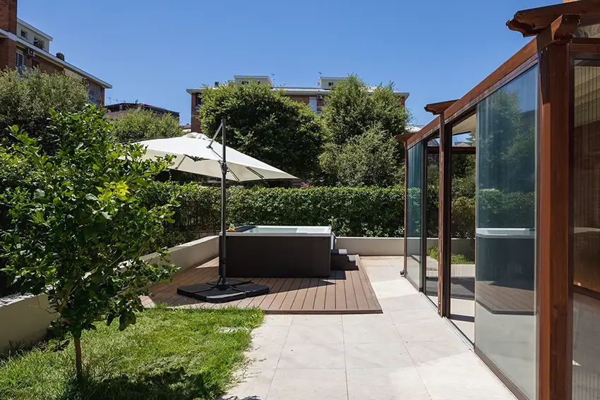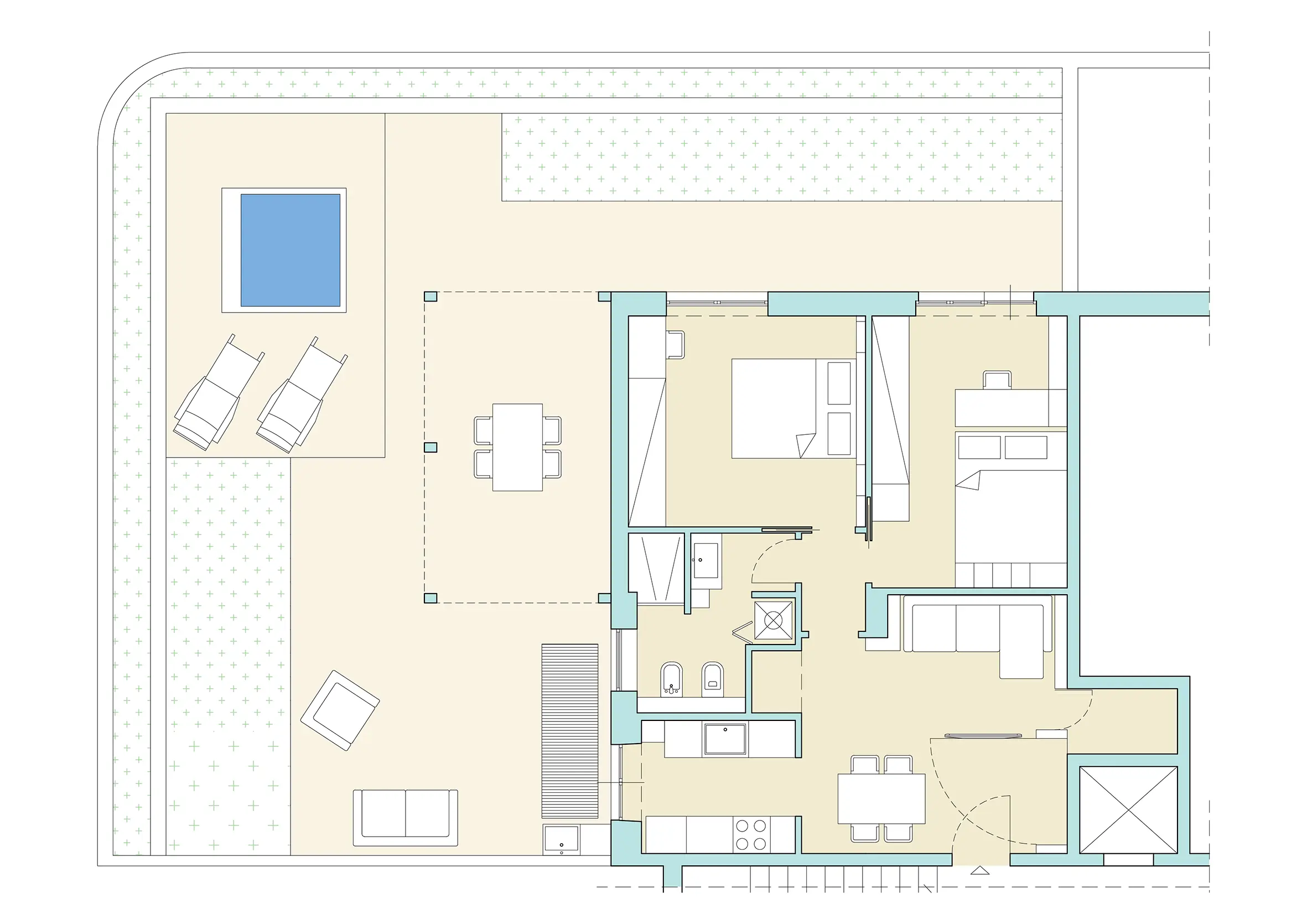 Il giardino ha subito una trasformazione completa per poter essere vissuto tutto l’anno. È stata realizzata una nuova pavimentazione per uniformare e delimitare le aree verdi, creando un ambiente più armonioso. È stata aggiunta una pergotenda, così da avere uno spazio coperto e protetto dove poter pranzare anche nelle giornate più soleggiate. Inoltre, è stata creata un’area relax con una mini piscina, perfetta per rinfrescarsi e godersi momenti di tranquillità.