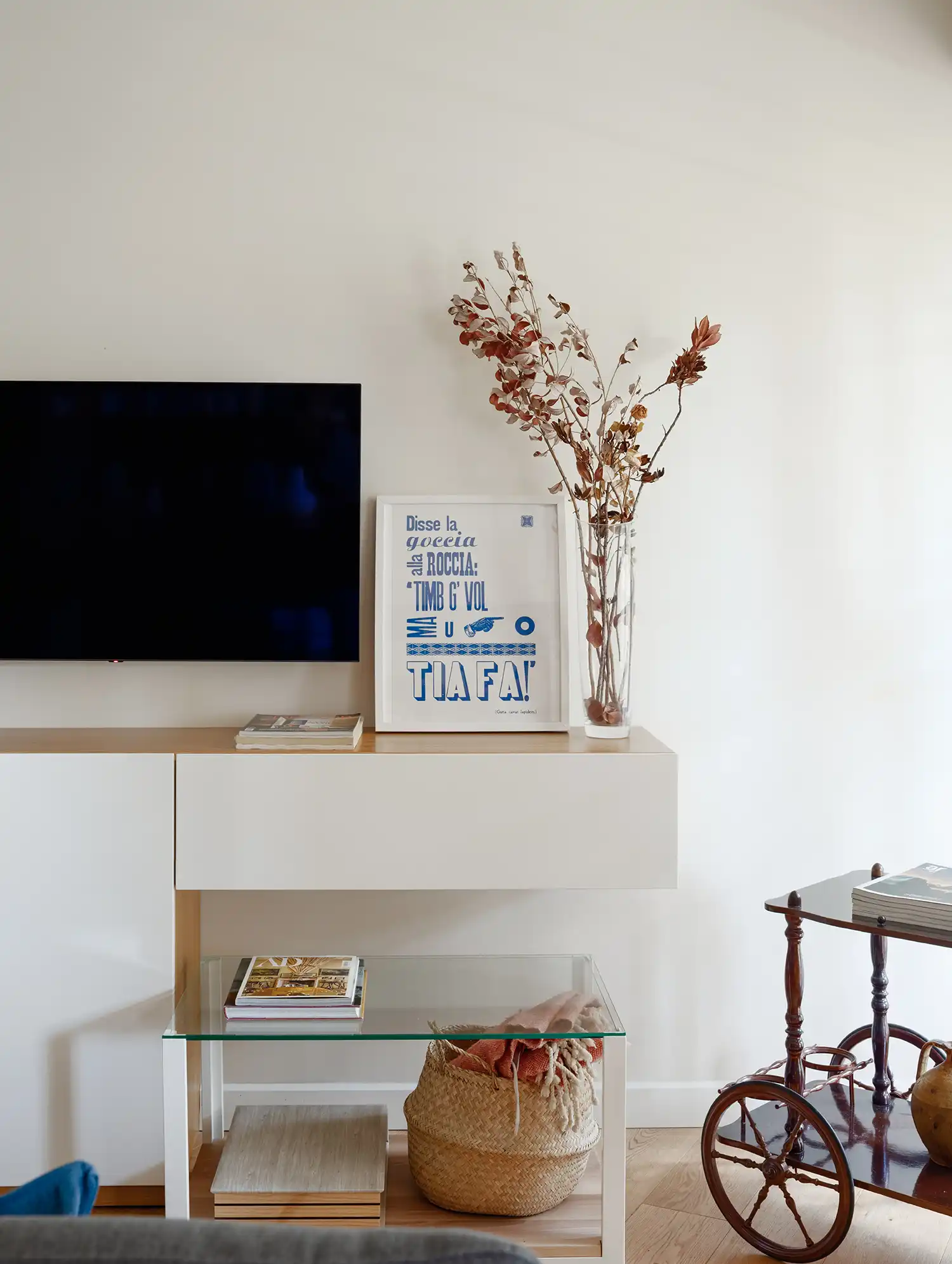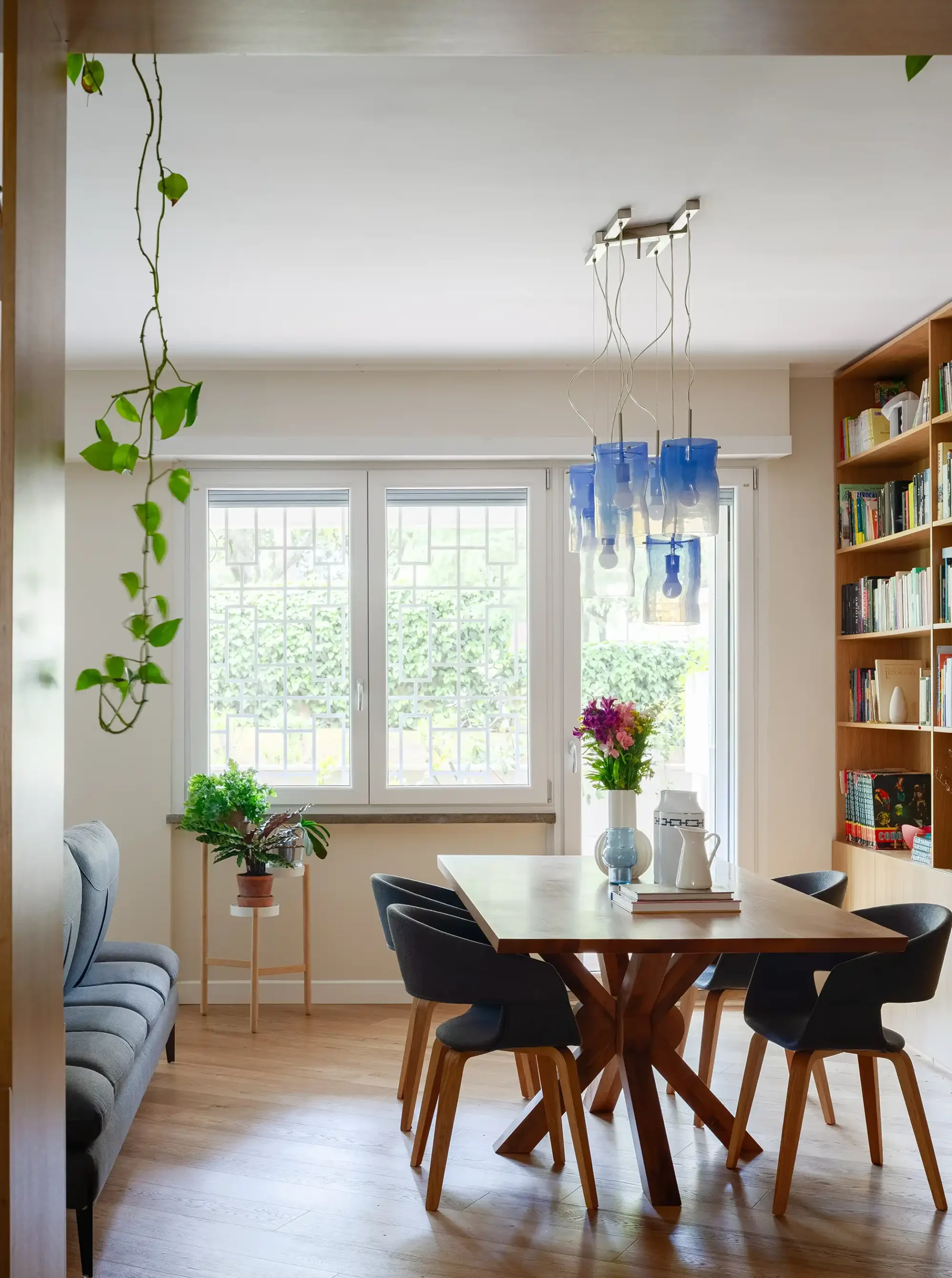 Un elemento distintivo che attraversa tutti gli ambienti è un sottile filo blu, presente nelle ceramiche, sulle pareti e negli oggetti decorativi, che crea un filo conduttore armonico in tutta la casa.